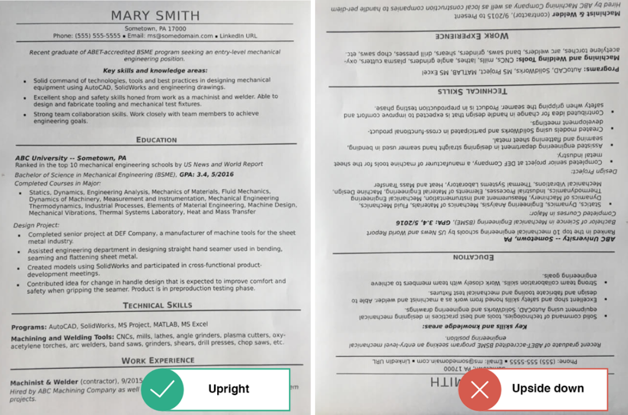 Always take upright, not upside down, snapshots of the resume. Having the snapshots upside down will slow down our OCR’s process of parsing the required information as additional picture rotation is required.