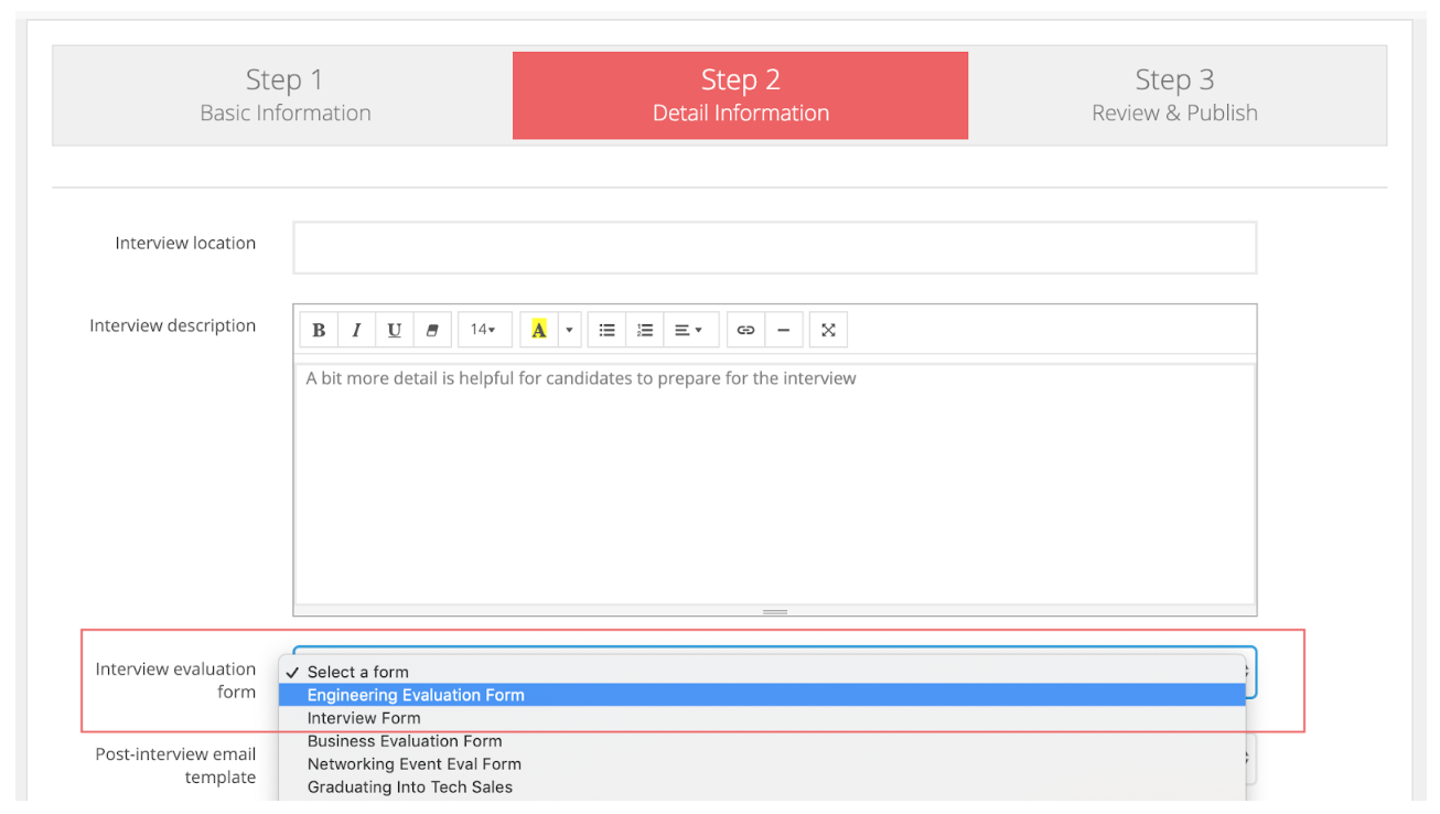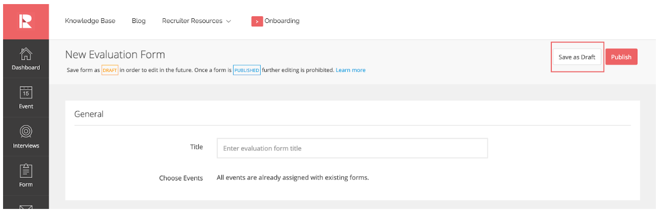 As you start attending more events and conduct more interviews, which might require creating various different forms, it can get confusing having to pick and choose from a long list of many forms. Thus, we highly recommend recruiters to use a short, concise and consistent method when naming the Evaluation Form.