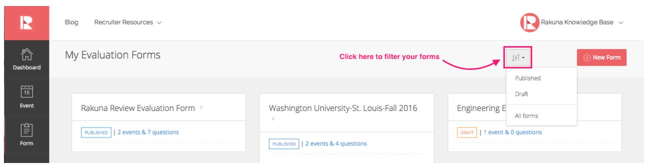 One of the most frequently asked questions we get about Forms from recruiters is “How do I organize my forms to show only Draft forms or Published forms?” The best way is to use the filter option to select whether you would like to see Published form only or Draft only or see all forms.
