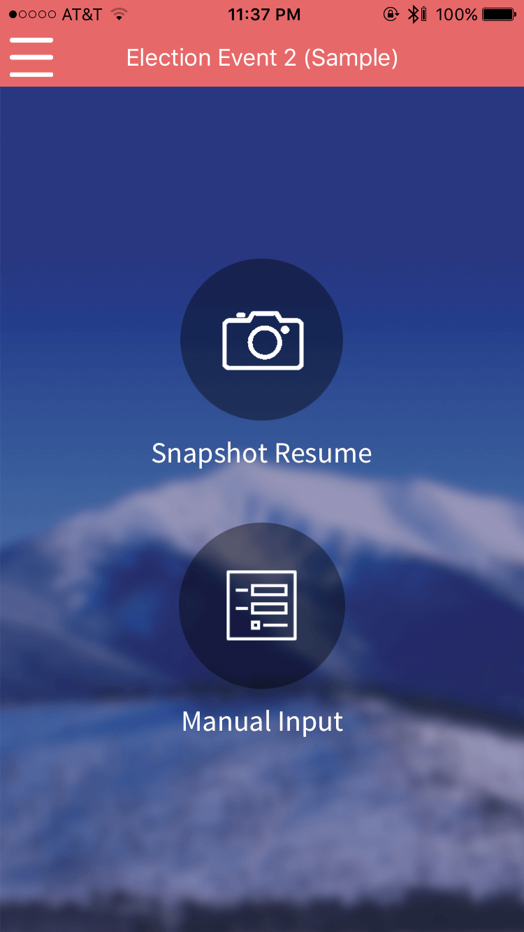 On your Mobile app, after choosing your event, you have two options of creating a new candidate’s profile: (1) Snapshot Resume or (2) Manual Input.