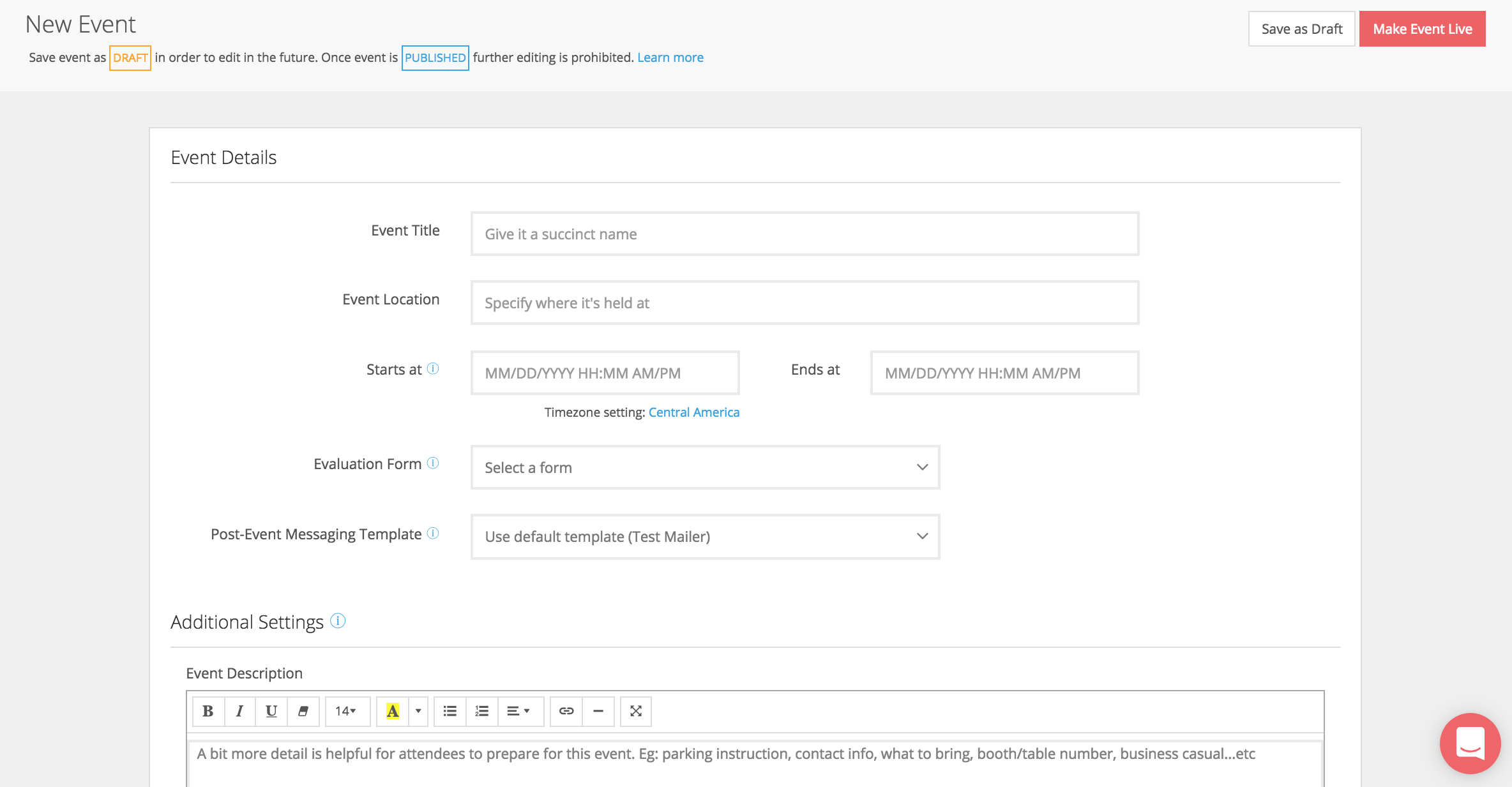 - Make sure to save your event as a DRAFT if the details of the event are not finalized yet. Once you make an event go live, the event will be in PUBLISHED mode and can no longer be edited.