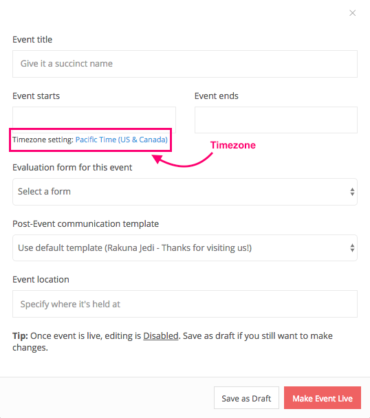 - Open the draft event and click “Timezone setting” (under the “Event Starts” box)