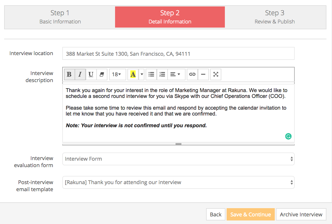 - Fill out detail information: Input interview location, description, and select interview evaluation form and post-interview messaging template you would like to use for the interview. If you don’t have the forms and templates ready yet, you can save the interview as Draft by clicking “Save and Continue” and exit to create new forms and/or templates before going back to the interview to continue publishing.