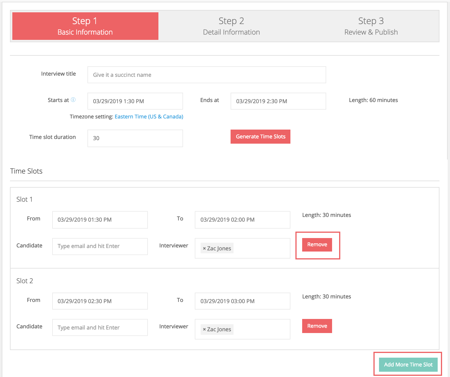 - Fill out basic information: Input title, start/end dates and time, and time slot duration (i.e: the length of your interview(s)). In each “Interview section”, input the candidate’s email if that specific time slot has already been confirmed with the candidate, or leave blank if there are multiple time slots for multiple candidates to pick and choose. Select the interviewer for each time slot using the drop down menu (make sure the interviewer has been added to your organization). Click “Save and Continue” to move to the next step. You can also add more time slots outside the overall time slot duration you have set by clicking the “Add More Time Slot” button. You can also remove individual time slot by clicking the red “Remove” button.