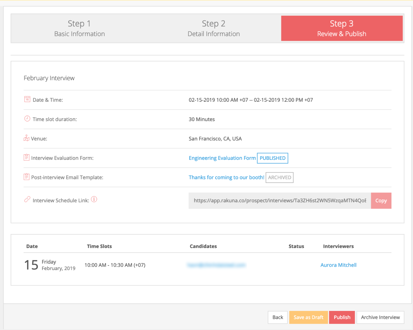 - Review and publish: Revise the interview information. You can either save the form as Draft for future edit (click “Save as Draft”), or “Publish” the interview. Upon publishing an interview, all selected candidates and interviewers will receive emails that include their interview’s information. For time slots that have not had any assigned candidates yet, you can copy the “Interview Schedule Link” and send it to candidates so they can choose the suitable interview time according to their availability. Both interviewers and candidates will receive confirmation when a time slot is booked as well as an interview reminder via email.