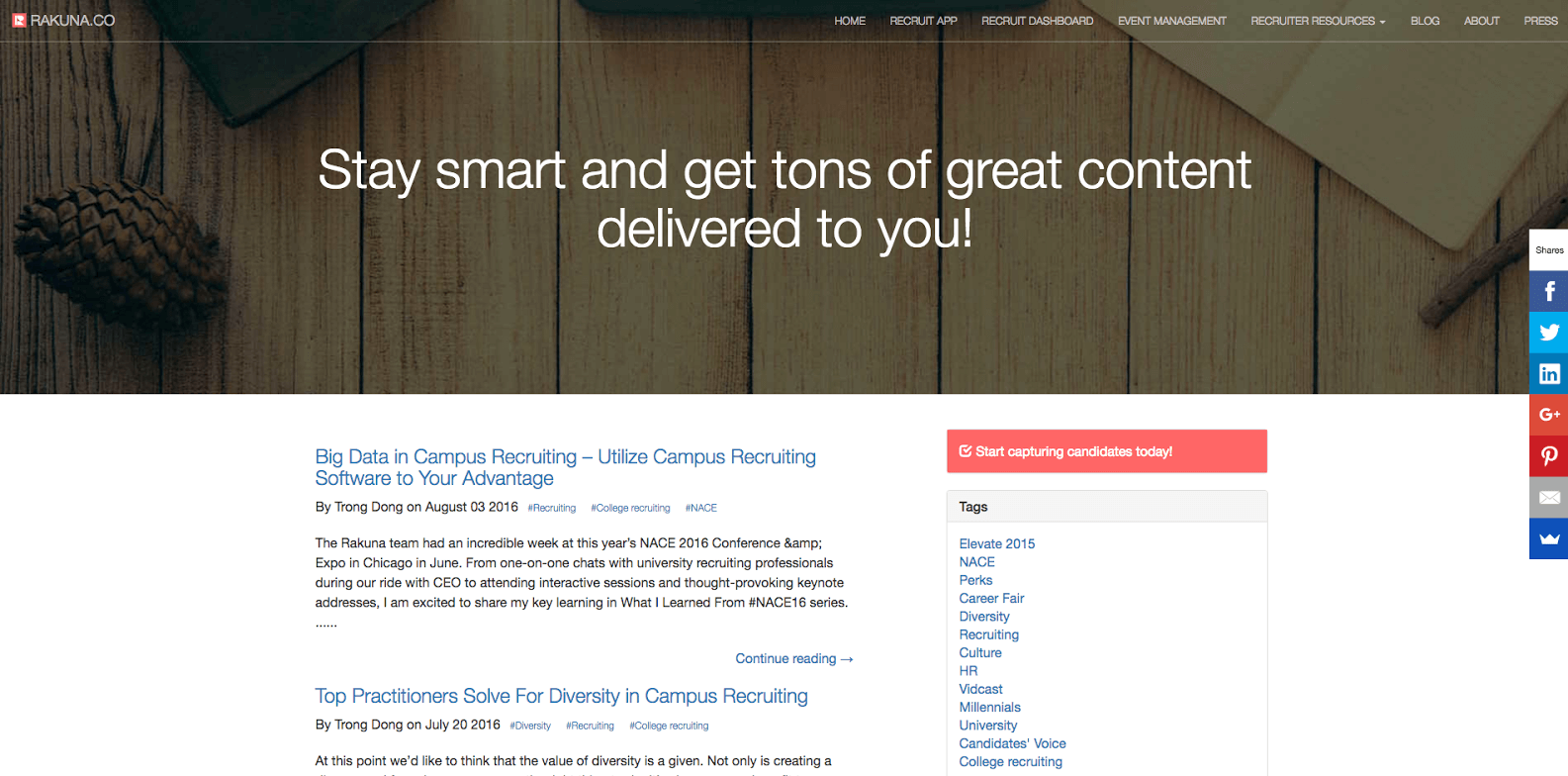 Check out Rakuna’s blog! Click the “Blog” icon next to the Rakuna logo in the top left corner of the screen. Rakuna blog is exclusively curated for our customers to keep you updated of recruiting trends and best practices.